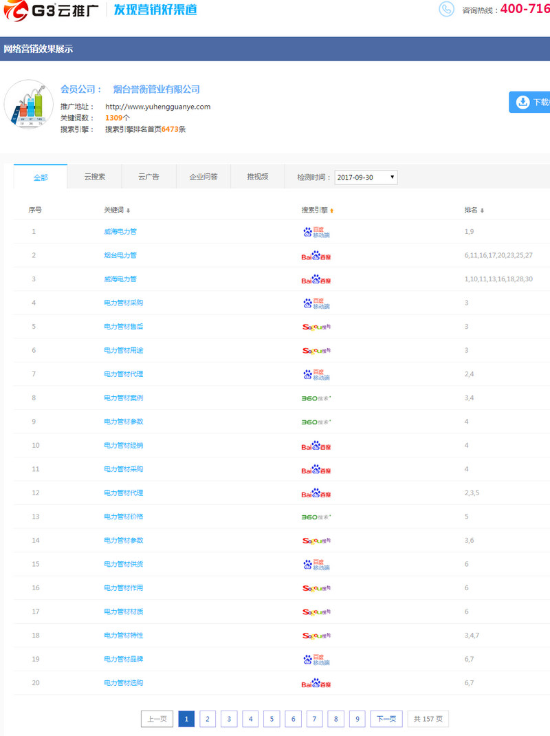 煙臺(tái)智聯(lián)網(wǎng)絡(luò)通過G3云搜索功能,實(shí)現(xiàn)了6473個(gè)搜索引擎排名首頁(yè)的關(guān)鍵詞。不僅在百度、搜狗、360還是在移動(dòng)端等搜索引擎上進(jìn)行同步曝光。