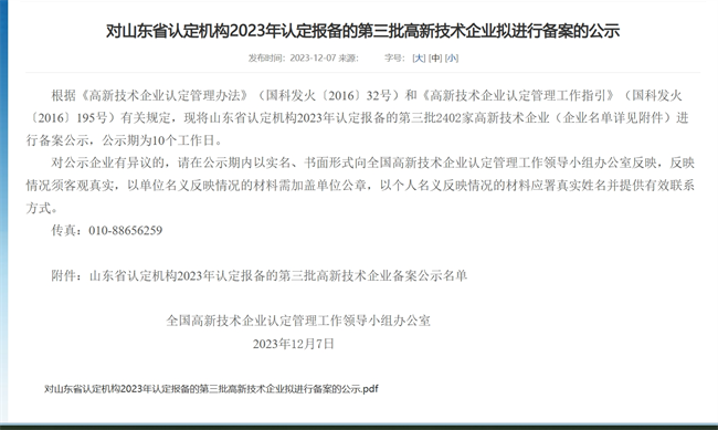 2023年12月7日,全國高新技術(shù)企業(yè)認定管理工作網(wǎng)發(fā)布了山東省認定機構(gòu)2023年認定報備的第三批高新技術(shù)企業(yè)備案名單,山東新智聯(lián)數(shù)字化有限公司順利通過山東省高新技術(shù)企業(yè)認定,成功邁入高新技術(shù)企業(yè)行列。